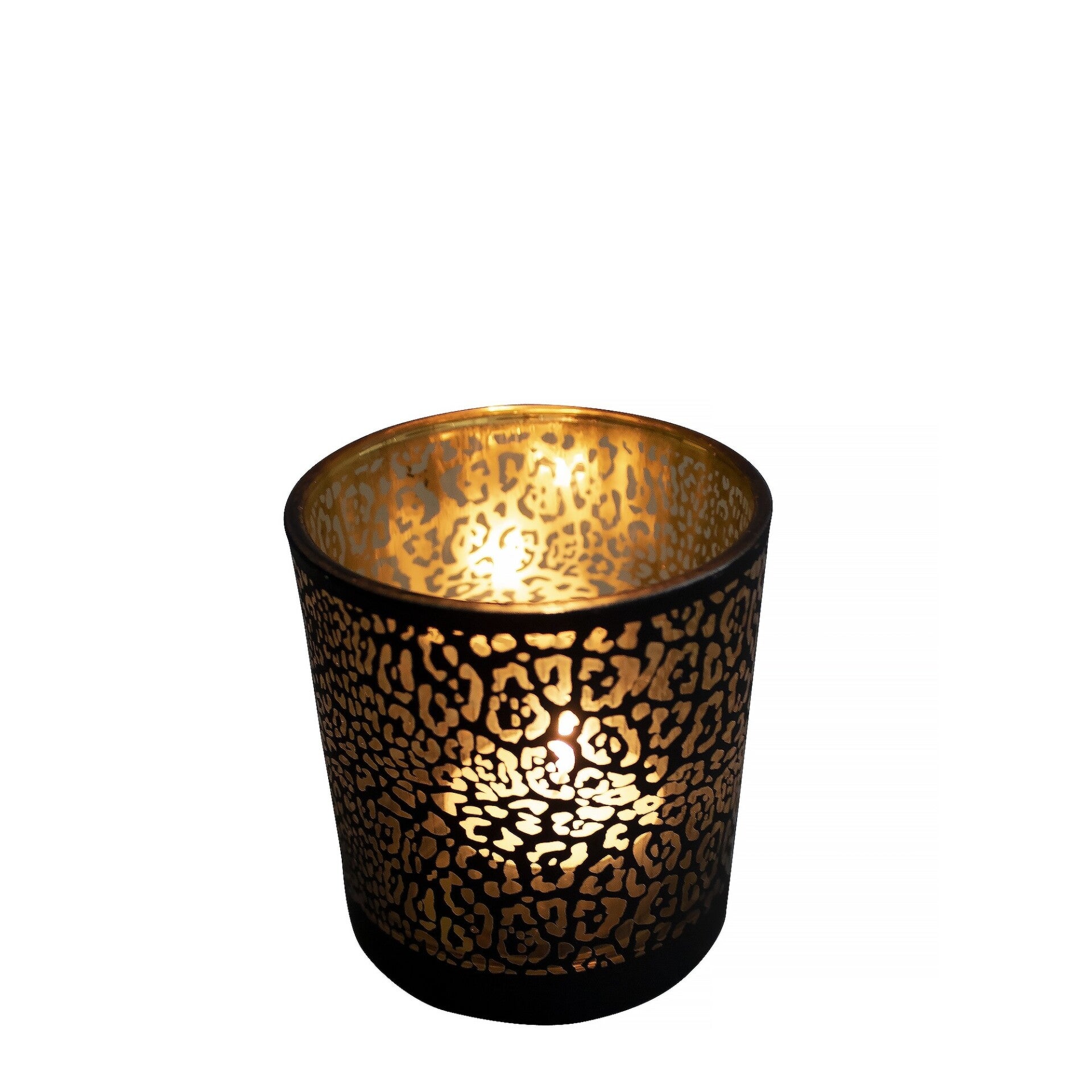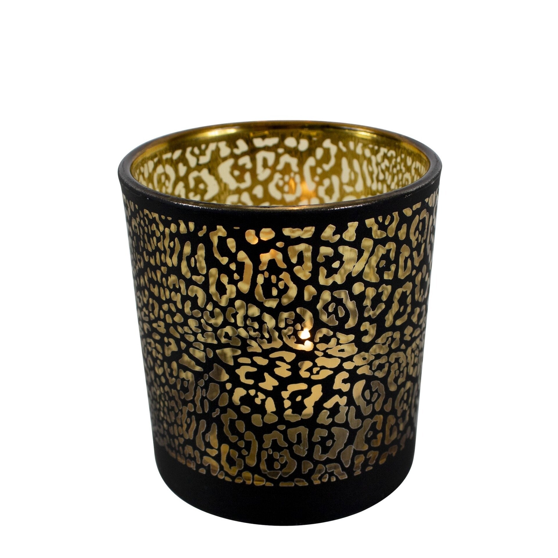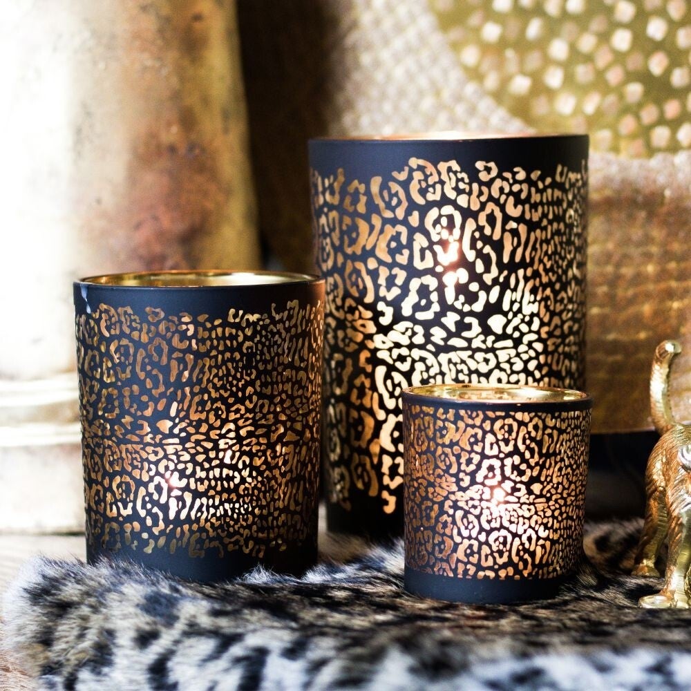 Schitterende windlicht met jaguar print in mat zwart met goud.