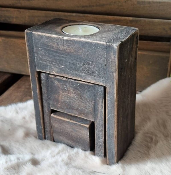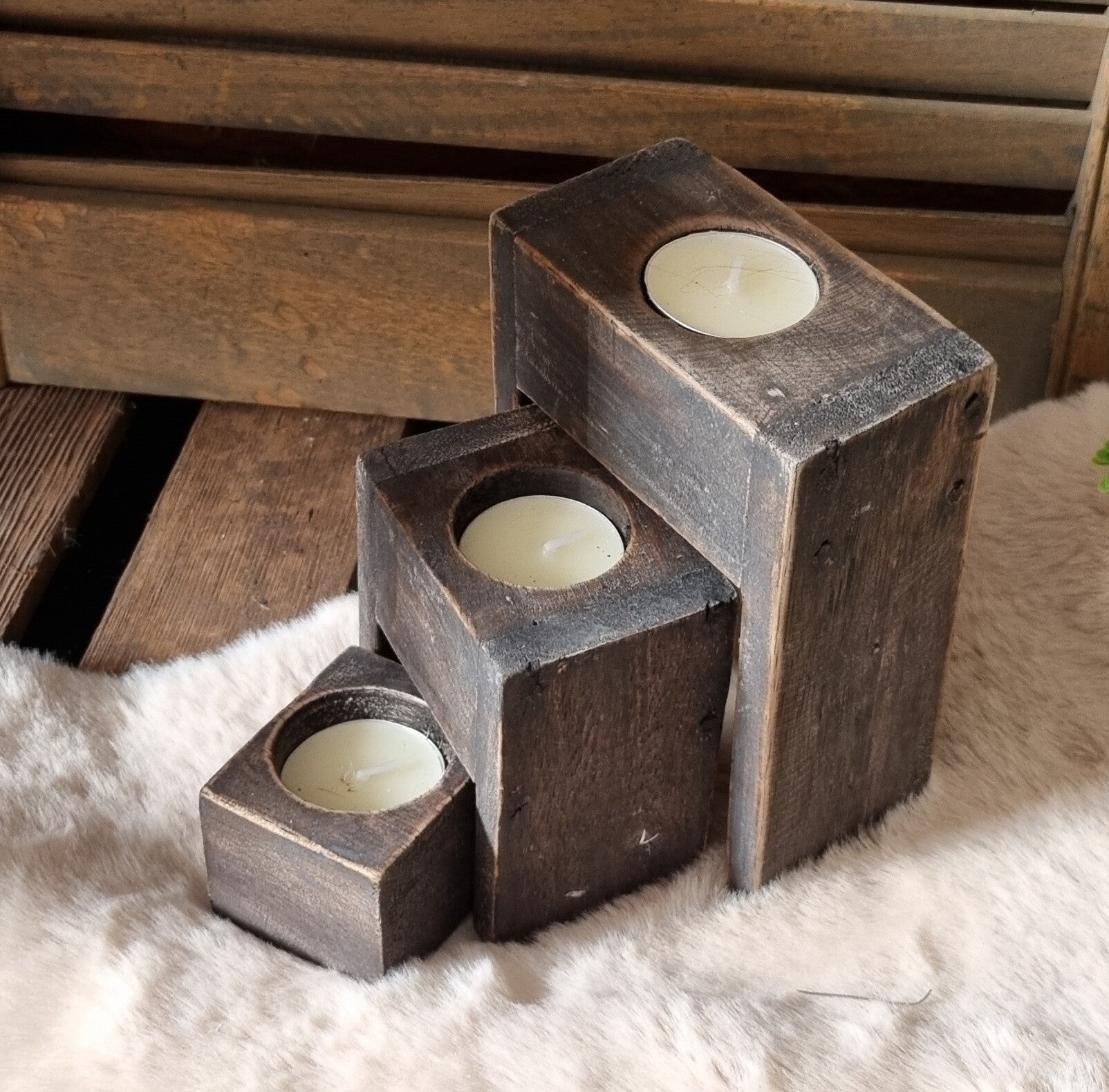 Schitterende oud houten waxinelichthouder voor 3 waxinelichtjes