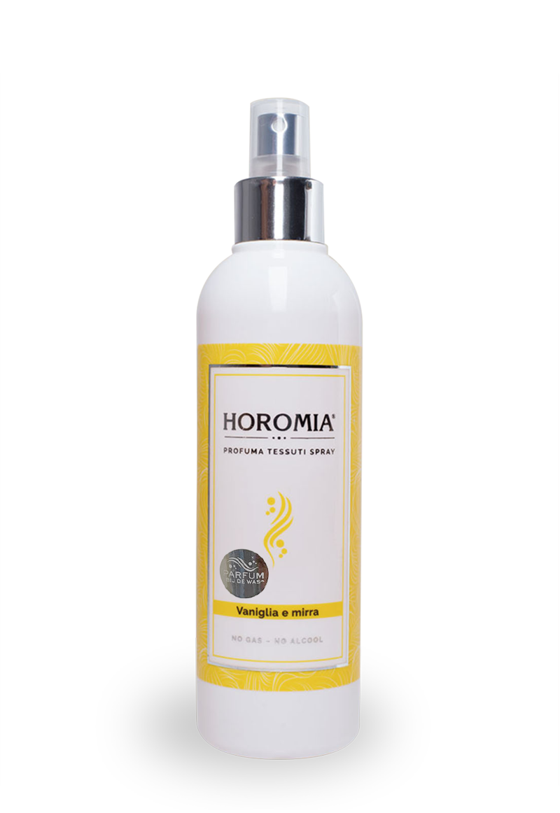 Horomia wasparfum en textielspray Vaniglia e Mirra, een heerlijke geurmix van citrus, mirre, vanille, witte musk en cederhout.