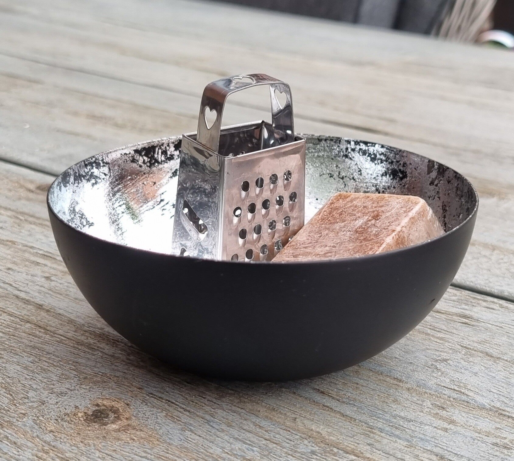 In combinatie met een schaaltje in zwart/zilver.